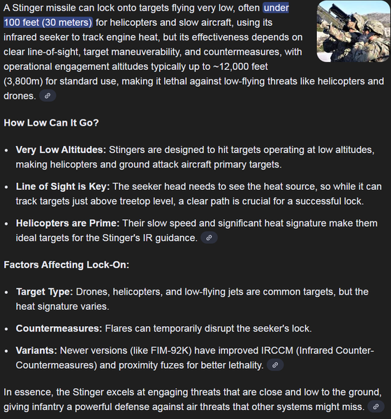 Speaking of low routes, I think the stinger should still lock on at lower altitudes. I was doing research of the stinger yesterday & I've played a lot of Arma 3 where I am constantly using a FIM-92 Stinger, this game has the stinger very subdued indeed in comparison.