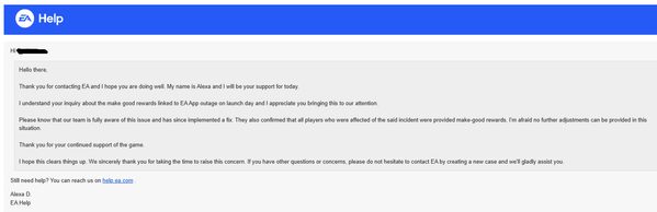 - RockEyeOG10 hours agoNewcomerI am still waiting for mine as well. I keep contacting EA Help and most of the replies I received were some auto-response that hasn't helped. Like I need instruction on how to find the inbox in the game for the compensation. I know where to find it.
