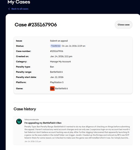 Can anyone within EA please explain to me how I have a game ban for BF6 on Playstation 5 when I do not own a PS5 nor have I ever owned a PS5. TOS team keeps auto denying my appeals now without any explanation as to why I have been banned on a console I do not own and have never signed into. EA's own logs on my account data show no Playstation activity on my EA account or BF6 yet I still have a PS5 ban.