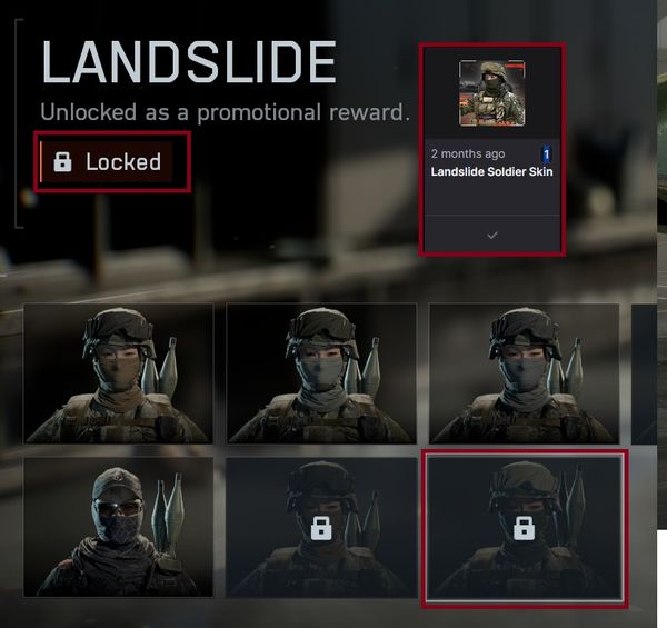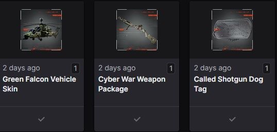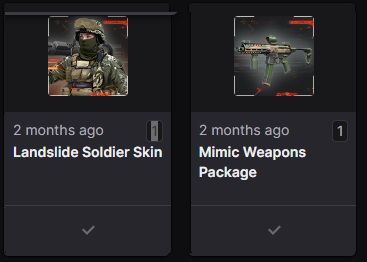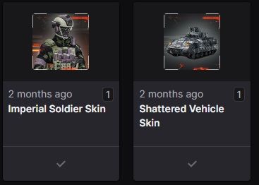 Drops I was supposed to earn: (Mimic Weapon Package, Landslide Soldier Skin, Shattered Vehicle Skin, Imperial Soldier Skin)
