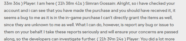 Your customer support has acknowledged the transaction and I have yet to receive my items. He said he can't issues items in game but I am sure someone can. Make this right.