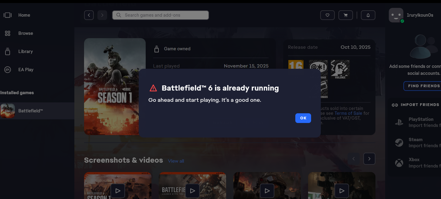it appear a message with already running, and the ea app is lauched by itself two times. i tried to repair the install, to reinstall the anti-cheat, clear cache of the app, run as administrator the bf6.exe. kind of everything, and also the report is not working on the app