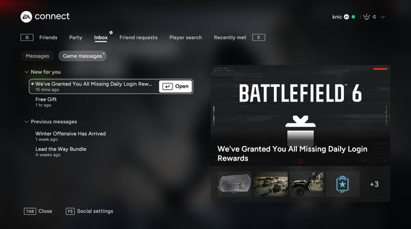 UPDATE: This is still an ongoing issue and has NOT been fixed yet to this day (12/13/2025). I contacted EA support about this issue and also the new ongoing Loyalty Rewards issue with playing previous Battlefield titles to get the Timberbolt Fighter Jet Skin, 2x 60 Min XP Tokens, and Jump In Soldier Skin and they said they will investigate and look into them. The in-game mail reward system is really buggy and inconsistent for many players. Hopefully we have things fixed by Season 2's launch.