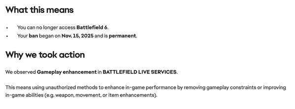 Details: On November 15th, as usual, I went to a computer club, rented a computer, and launched Battlefield 6. A permanent ban notification appeared on the screen. Yes, I don't have a personal computer. In our city (Baku, Azerbaijan), there are many special computer clubs where people come to play video games. After you play and close your session, the computer resets to the club's settings. Your accounts are erasing from memory, and any downloads are also erasing. There are also special settings that prevent unpacking files downloaded from the internet or uploaded via a flash cards. Why im telling this? Cuz yes, who knows maybe there was something wrong with last computer that i rented. But it doesn’t mean that i used cheats. And if EA support had actually done an investigation, as a human not as a robot, they would have known about it.