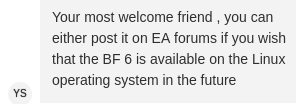 No I am not banned from battlefield 6. No I don't have battlefield 6. I am creating a post because the agent I spoke with advised me to make a forum post requesting Linux be supported.