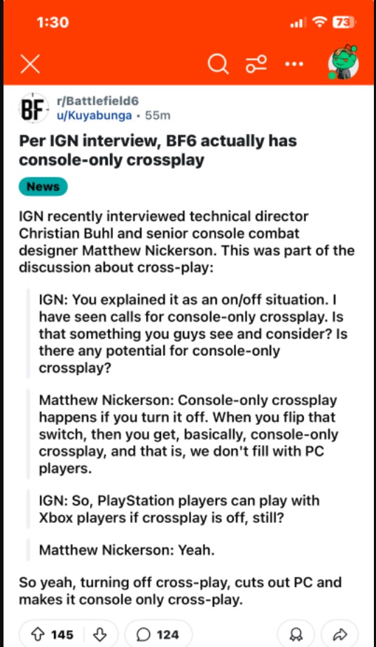 ”Eyy not quite, it's crossplay on or off - but if crossplay is on we treat it as console preferred crossplay, so we'll try and matchmake you with others playing on console before falling back to full crossplay if we can't find you a match with only/mostly console players.”