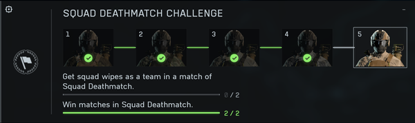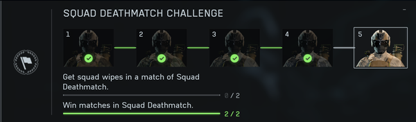 Im on challenge 5. Purely luck based. Get 2 squad wipes in a match pf squad deathmatch. How are we soposed to do that when people insta respawn. Getting 1 squad wipe in a match isnt easy but 2, 2??? Redicilous lol might aswell start playing lottery id have nore chance!