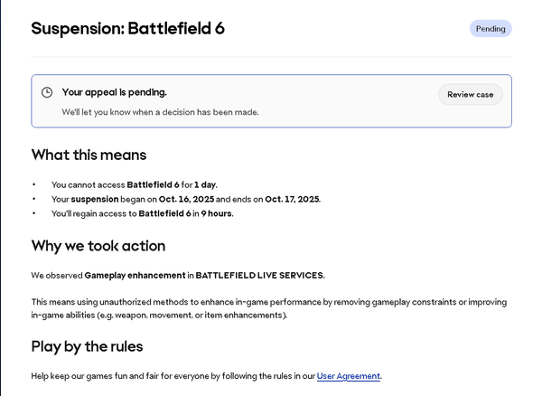 Last night, I was playing Besieged on the custom portals on BF6 and other community portals, and I was suspended for one day. which makes no sense, I also don't use any enhancements anyone else have the same problem?
