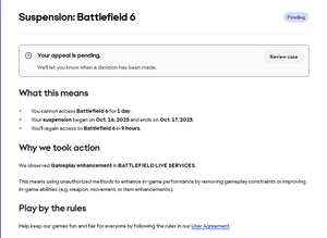 Last night, I was playing Besieged on the custom portals on BF6 and other community portals, and I was suspended for one day. which makes no sense, I also don't use any enhancements anyone else have ...