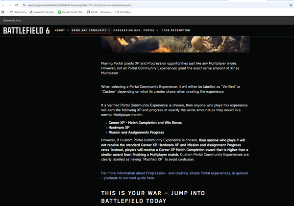 1. Re-enable Full XP on Official Game Modes: Progression (Full XP, Weapon Masters, Unlocks) must be fully restored for Portal experiences based on the official game types, even with AI bots filling the slots (i.e., Conquest, Rush, Breakthrough, Escalation, Team Deathmatch, FFA, and King of the Hill), in both Normal and Hardcore settings.