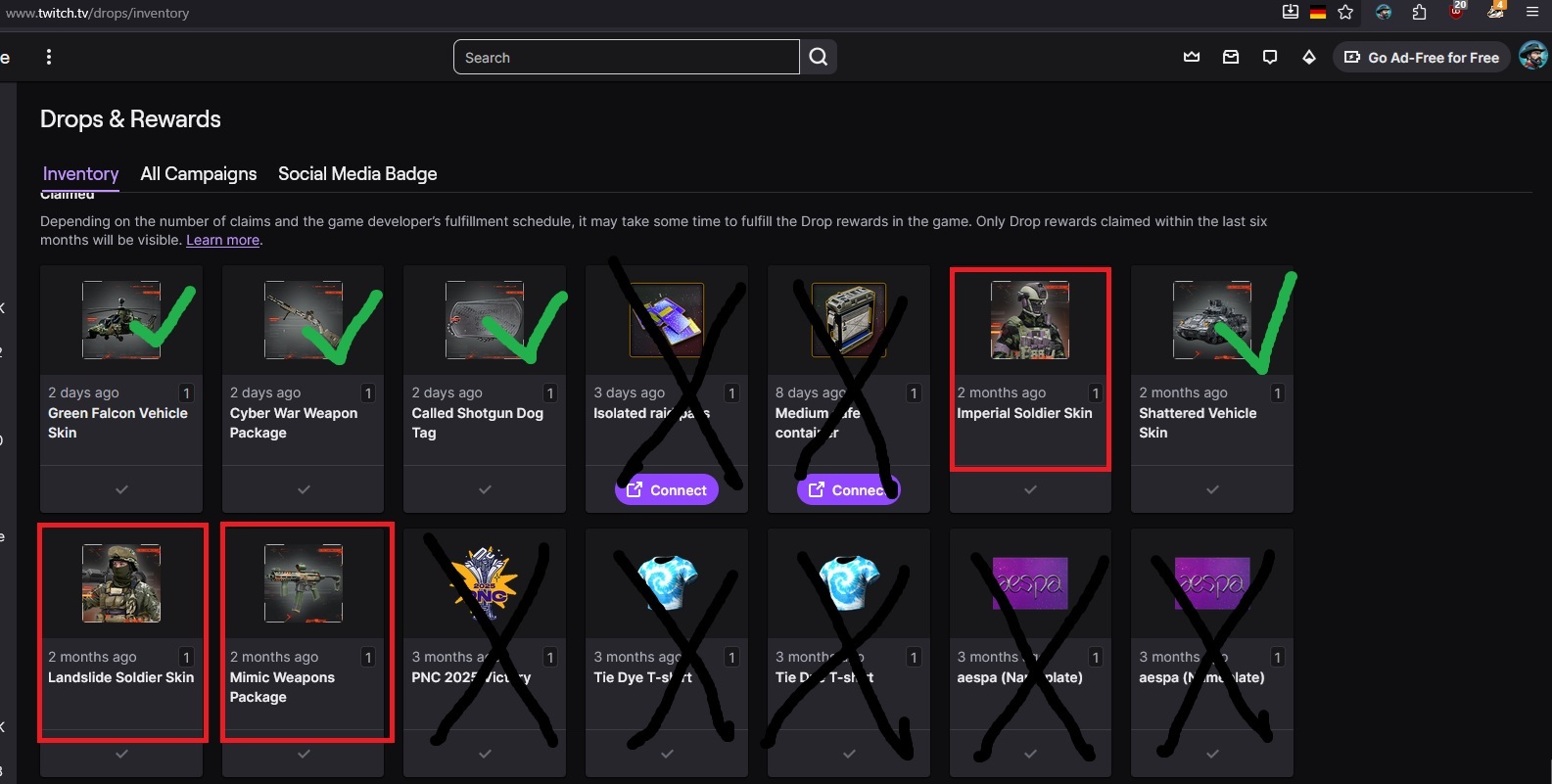 I also have a problem. I didn't receive the Imperial Soldier skin, the Broken Vehicle skin, the Landslide Soldier skin, or the Anthropomorphic Weapon Pack (from the beta Twitch event).