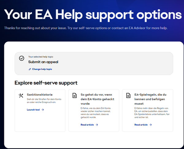 I already got into contact with the support only via the Compromised Account option, that support told me to open another ticket via the Submit a Appeal option however there is no option to actually contact anyone there? I filled out the form but in the screenshot below you can clearly see that the "Contact via Live Chat" or "Contact via Call" options are missing.