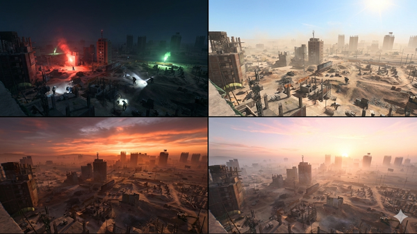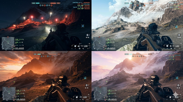 Al mediodía, el combate favorece enfrentamientos de larga distancia y superioridad aérea. Durante el atardecer, las sombras modifican ángulos dominantes. Mientras que en la noche, el combate se comprime, la iluminación se vuelve recurso táctico y cambia la jerarquía de roles.