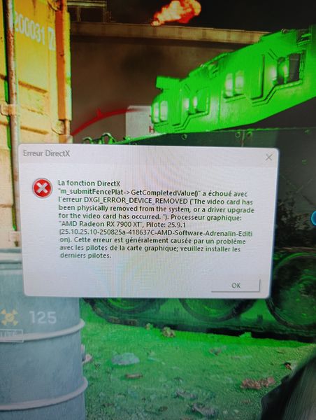 J'ai actuellement cette erreur "m_submitFencePlat" qui apparait au bout d'un certain temps en multi, le temps est aléatoire. Cela se produit à chaque sessions. J'ai réinstalle les pilotes graph (7900 XT ) , Window à jour. Paramètre graphique faible ou ultra c'est pareil. C'est très frustrant, apparement pas le seul dans se cas au vue des recherches Google, si quelqu’un a une solution qui fonctionne .