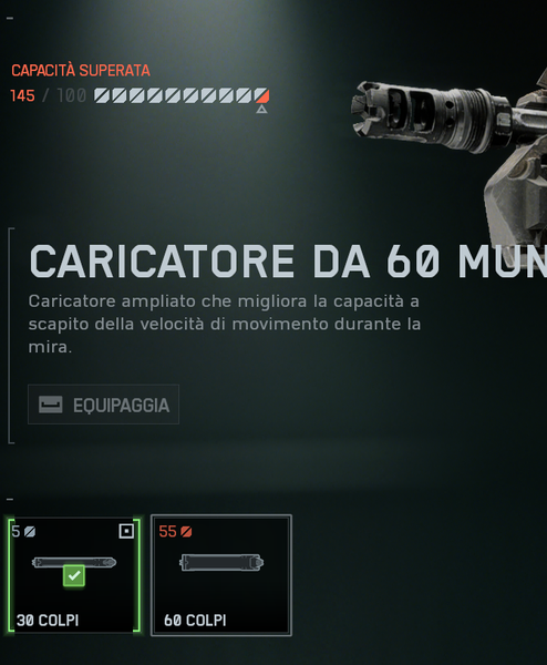 Quindi quando evidenzi il caricatore da 60 colpi (che richiede 55 punti) ti dice che la capacità è superata.