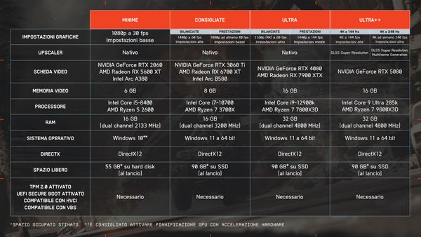 Per un'esperienza con prestazioni Ultra ideale a 144 fps (frame al secondo) a 1440p, le impostazioni consigliate sono state modificate da alte a medie per aiutare a mantenere prestazioni più costanti per un gameplay a fps elevati sull'hardware consigliato.