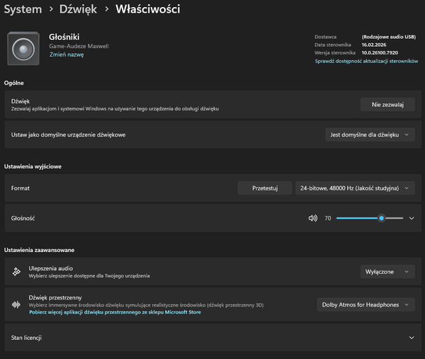 - W Windows wejdź w: Ustawienia > System > Dźwięk > urządzenie wyjściowe > Dźwięk przestrzenny.