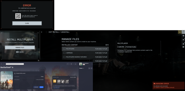Chce pograć w bf6 ale niestety nie mogę... W grze mam informację o braku zawartości gry wielosobowej, a jak sprawdzałem w EA app to wszystko było. Naprawiałem raz grę. Odzyskiwałem appkę i teraz mam błąd jak w załączniku. Pomóżcie