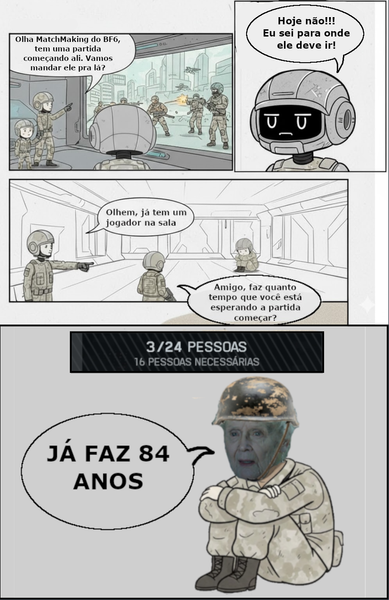 Fiz esse quadrinho para ilustrar lógica do MatchMaking do Battlefield 6. Em vez de te jogar no meio da ação onde a bala tá comendo solta, o balanceamento insiste em te mandar para o limbo de uma sala vazia. Isso é uma falha bizarra do sistema de um jogo que devia manter a diversão 24/7. O game ignora as partidas ativas e decide por conta própria isolar o jogador em uma sala deserta. Espero de verdade que essa lógica de busca seja corrigida, para que a comunidade possa aproveitar partidas sequenciais sem esperas prolongadas.