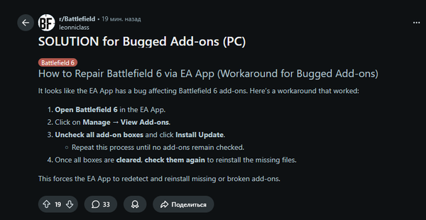 на реддите предлагают такой вариант со снятием галок аддонов и переустановкой