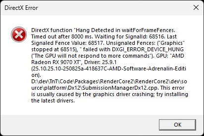 DirectX function "m_submitFencePlat-> GetCompletedValue(" failed with DXGI_ERROR DEVICE REMOVED ("The video card has been physically removed from the system, or a driver upgrade for the video card has occurred. "). GPU: "AMD Radeon RX 9070 XT, Driver: 25.10.1
