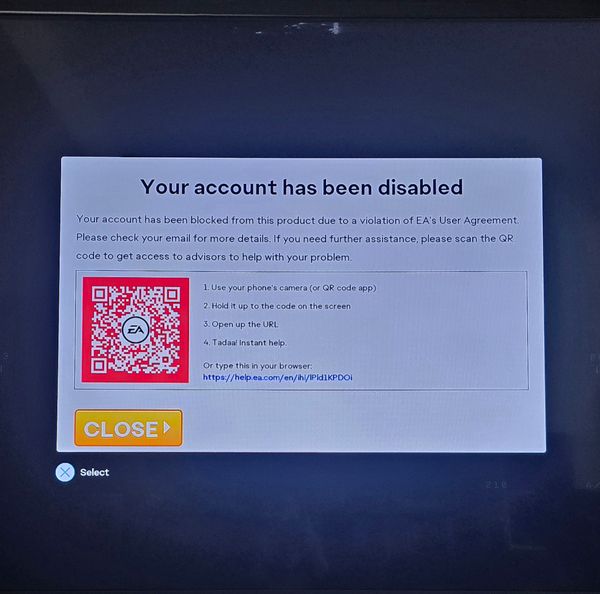 I installed the game from the disc onto my ps5 and as soon as I launch the game I get a message that my account has been blocked due to a violation of EA's User Agreement.