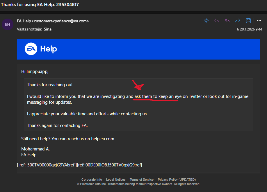 None of this helped me in any way, and I have only wasted my time. If only EA-help could do their jobs and be straight forward. I wanted an answer in the realm of "we are aware of the issue, it being this and this, and it should be solved by x date / in x weeks". Them not doing this almost proves that nothing is being done, and no resources are allocated towards solving it.