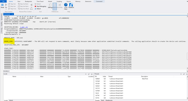 (I'll also get Error "0x887a0005 -The GPU device instance has been suspended. Use GetDeviceRemovedReason to determine appropriate action" and "0X887a0006 - The GPU will not respond to more commands, most likely because of an invalid command passed by the calling application")