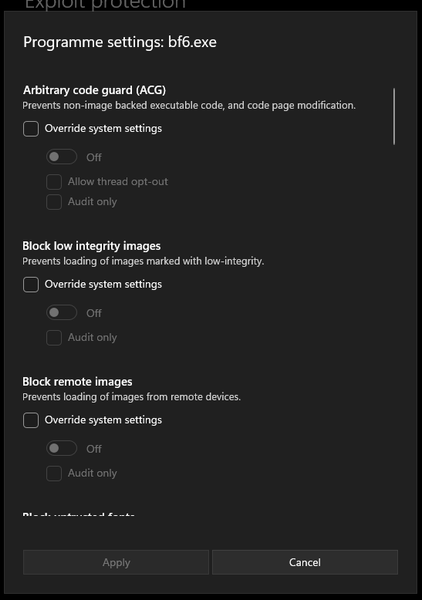 Locate bf6.exe and then if there are any settings set to "On", click on "Override system settings" for that setting and toggle it to off.