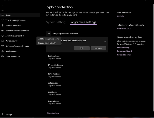 Go into exploit settings on Windows and hit the + button and then click on "Choose exact file path".