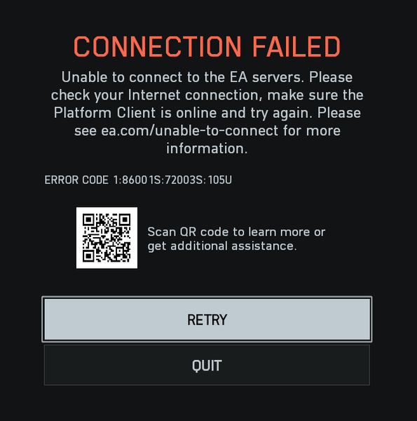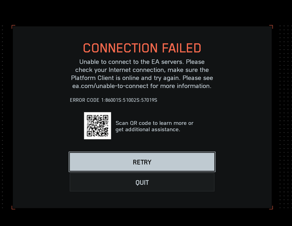 We appreciate your patience whilst we got to work on this, see you on the Battlefield!In terms of the other main "Connection Failed 1:86001S:51002S:57019S" issue, the team is still investigating, but unfortunately we've got no further updates to share at this time.