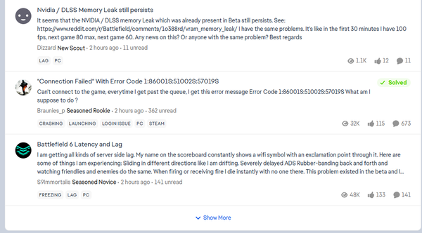 Having issues with Battlefield 6? Join here to find help with connectivity, performance issues, crashes and more.Latest Activity: 3 minutes ago