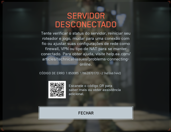 - "SERVIDOR DESCONECTADO" com o código 1:85008S:17862870170:-21465661440, sugerindo verificar a conexão.