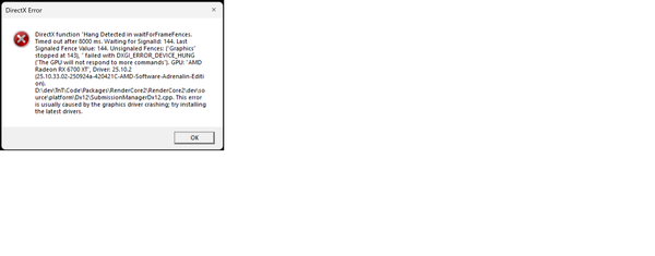 Hi all. Ive owned this game for a few weeks and have played it less than five times. I keep getting this error as soon as i click on continue mission. The game crashes to desktop with the same error every time i launch it. I built this computer recently, has decent components and all drivers are up to date., Specs are windows11 64bit. Gigabyte B650M gaming wifi motherboard. Amd ryzen7 7700x 8core cpu. 32 gig ram. and ssd drives. ive tried all the usual stuff. disabling any game overlays. running gpu settings at perfomance and not allowing windows to determine it. checked the games files. dont know what else to try