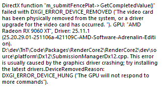 DirectX function "m_submitFencePlat->GetCompletedValue()" failed with DXGI_ERROR_DEVICE_REMOVED ("The video card has been physically removed from the system, or a driver upgrade for the video card has occurred. "). GPU: "AMD Radeon RX 9070 XT", Driver: 25.11.1 (25.20.29.01-251106a-421109C-AMD-Software-Adrenalin-Edition). D:\dev\TnT\Code\Packages\RenderCore2\RenderCore2\dev\source\platform\Dx12\SubmissionManagerDx12.cpp. This error is usually caused by the graphics driver crashing; try installing the latest drivers.DeviceRemovedReason: DXGI_ERROR_DEVICE_HUNG ("The GPU will not respond to more commands").