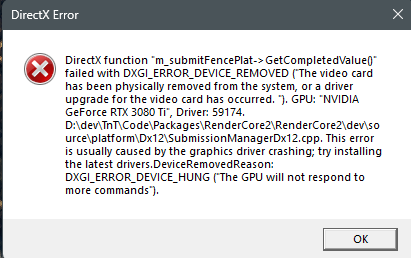 DirectX function "m_submitFencePlat->GetCompletedValue()" failed with DXGI_ERROR_DEVICE_REMOVED ("The video card has been physically removed from the system, or a driver upgrade for the video card has occurred. "). GPU: "AMD Radeon RX 9070 XT", Driver: 25.11.1 (25.20.29.01-251106a-421109C-AMD-Software-Adrenalin-Edition). D:\dev\TnT\Code\Packages\RenderCore2\RenderCore2\dev\source\platform\Dx12\SubmissionManagerDx12.cpp. This error is usually caused by the graphics driver crashing; try installing the latest drivers.DeviceRemovedReason: DXGI_ERROR_DEVICE_HUNG ("The GPU will not respond to more commands").