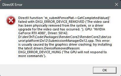 Direct function "m_submitFencePlat->GetCompletedValue" failed with DXGI_ERROR_DEVICE_REMOVED ("The video card has been physically removed from the system, or a driver upgrade for the video card has occurred. "). GPU: "NVIDIA GeForce RTX 4060