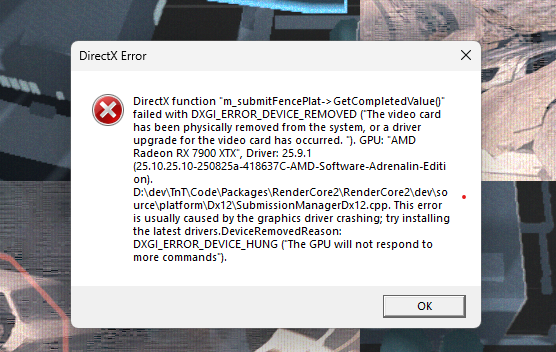 e\platform\Dx12\SubmissionManagerDx12.cpp. This error is usually caused by the graphics driver crashing; try installing the latest drivers.DeviceRemovedReason: