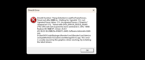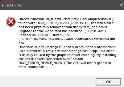 e\platform\Dx12\SubmissionManagerDx12.cpp. This error is usually caused by the graphics driver crashing; try installing the latest drivers.DeviceRemovedReason: