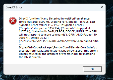 DirectX function "Hang Detected in waitForFramefences. Timed out after 8000 ms. Waiting for Signal: 264525. Last Signaled Fence Value: 264526. Unsignaled fences: (Graphics stopped at 264524)." failed with DXGI_ERROR_DEVICE_HUNG ("The GPU will not respond to more commands"). GPU: "NVIDIA GeForce RTX 4070 Laptop GPU", Driver: 537.13