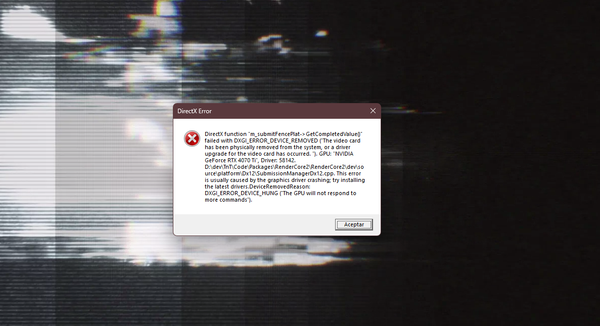 Direct function "m_submitFencePlat->GetCompletedValue" failed with DXGI_ERROR_DEVICE_REMOVED ("The video card has been physically removed from the system, or a driver upgrade for the video card has occurred. "). GPU: "NVIDIA GeForce RTX 4060