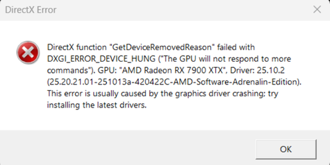 DXGI_ERROR_DEVICE_HUNG ("The GPU will not respond to more commands").