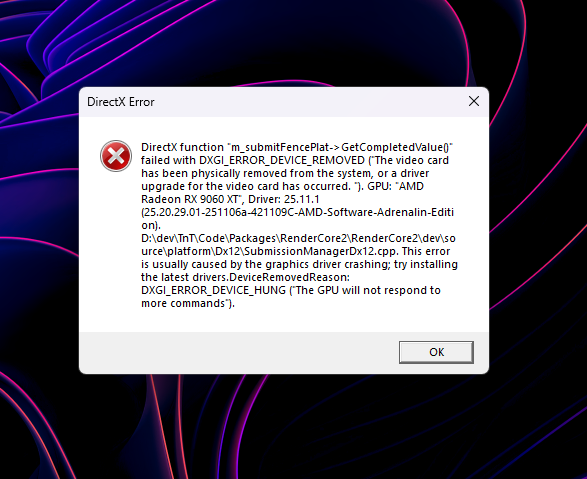 Even stranger anecdote is that my Victus 15L Desktop with a 4060 8GB, 32 GB DDR4 Ram on XMP because it's locked on that MOBO, and 5700 G, ran on high settings and never had a crash and I would consistently use Omen Hub to wipe any memory cache and free up ram just to increase some performance. Now, again, "coincidentally" my brand new 9060 XT 16 GB, with 32 GB DDR5 Ram, and 7800X3D all completely up to date with every possible driver, windows update, BIOS, etc. suddenly is an "issue", yet, simply restarting the PC and going right into the game without launching anything else gave me hours and multiple days of gameplay but simply changing weapons to try and run a new one started new crashes.
