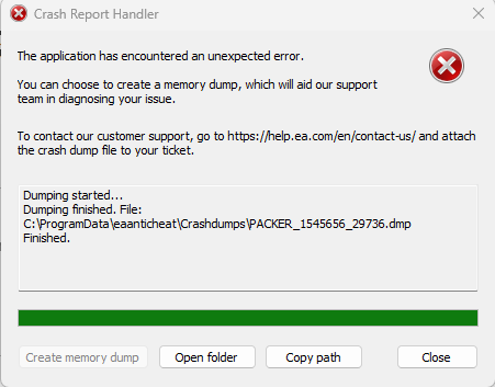 EA Javelin Anticheat encountered an error. Please restart your PC. : C:\Program Files\EA\AC\EAAntiCheat.GameService.exe ( 7 ) ( 2 ) Dumping failed. Log: Dumping started... Internal error #4: C0000210 Failed.
