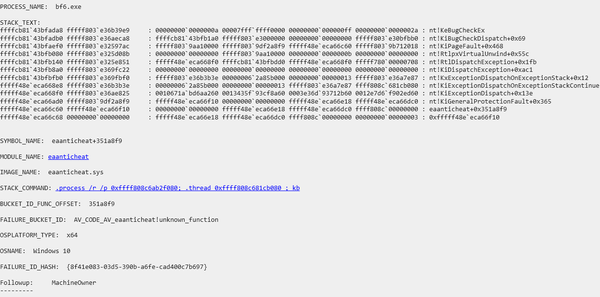 So I have tried everything from verifying files to reinstalling the game and alot more. I ended up after hours on hours of troubleshooting decided to clean wipe my pc and set it up as a new pc. Once I had it installed on steam I then ran the game and was able to play for about a hour before the black screen of death happened giving me a error at the bottom saying something with eaanticheat. I am lost how to fix this issue if anyone has any idea on what I can do please let me know thank you.