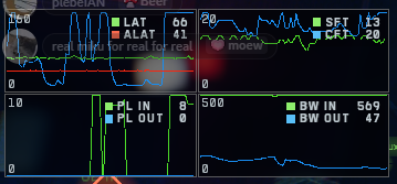 The blue line represents time nudge (TN) in the LAT and ALAT graph. When the framerate drops below 60fps, time nudge (TN) spikes and causes network lag. A framerate over 60fps is needed to prevent time nudge (TN) spiking.