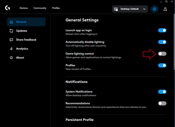 Go to settings in G-Hub (cog wheel) and de-select 'Game Lighting Control' (turn off)
