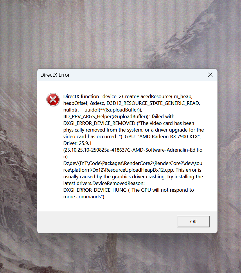 My game crashes from time to time. On average 2 hours session, it crashes at least once. But it happens everyday. Error is described in the picture. I have new PC with Radeon 7900 XTX GPU, drivers are updated. Any help would do! Thank you in advance