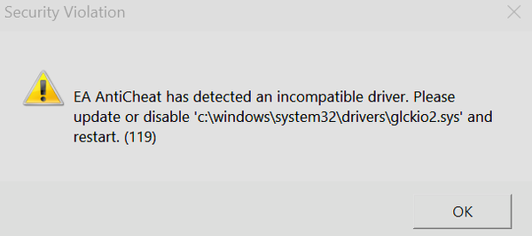 Today when trying to launch the game, I was hit with this error code "EA AntiCheat has detected an incompatible driver. Please update or disable 'c\windows\system32\drivers\glckio2.sys' and restart (119)"