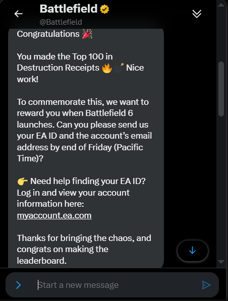 On Sep 25 I was contacted by the official Battlefield account at X that I have placed in the top 100 of the BF6 Destruction receipt challenge in the BF6 Open Beta and to provide them with my EA ID and email and on launch I will have a surprise. I did that and started waiting like a kid for Christmass.